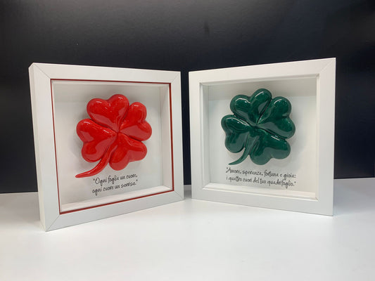 🌿 Cornice in legno con quadrifoglio in ceramica colore rosso – simbolo di fortuna e amore