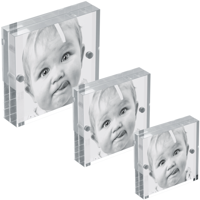 Portaritratti in acrilico trasparente con magneti. Doubleface. Spessore delle lastre di acrilico: 10+10mm, per i formati piu' grandi 12+12mm. Le misure mostrate sono quelle della foto che possono contenere, non esterne (quelle esterne sono un paio di cm piu' grandi, eccetto 8,6x5,4, 10,8x8,6, 7x7, 15x15, 20x30). Disponibile in formato bomboniera.