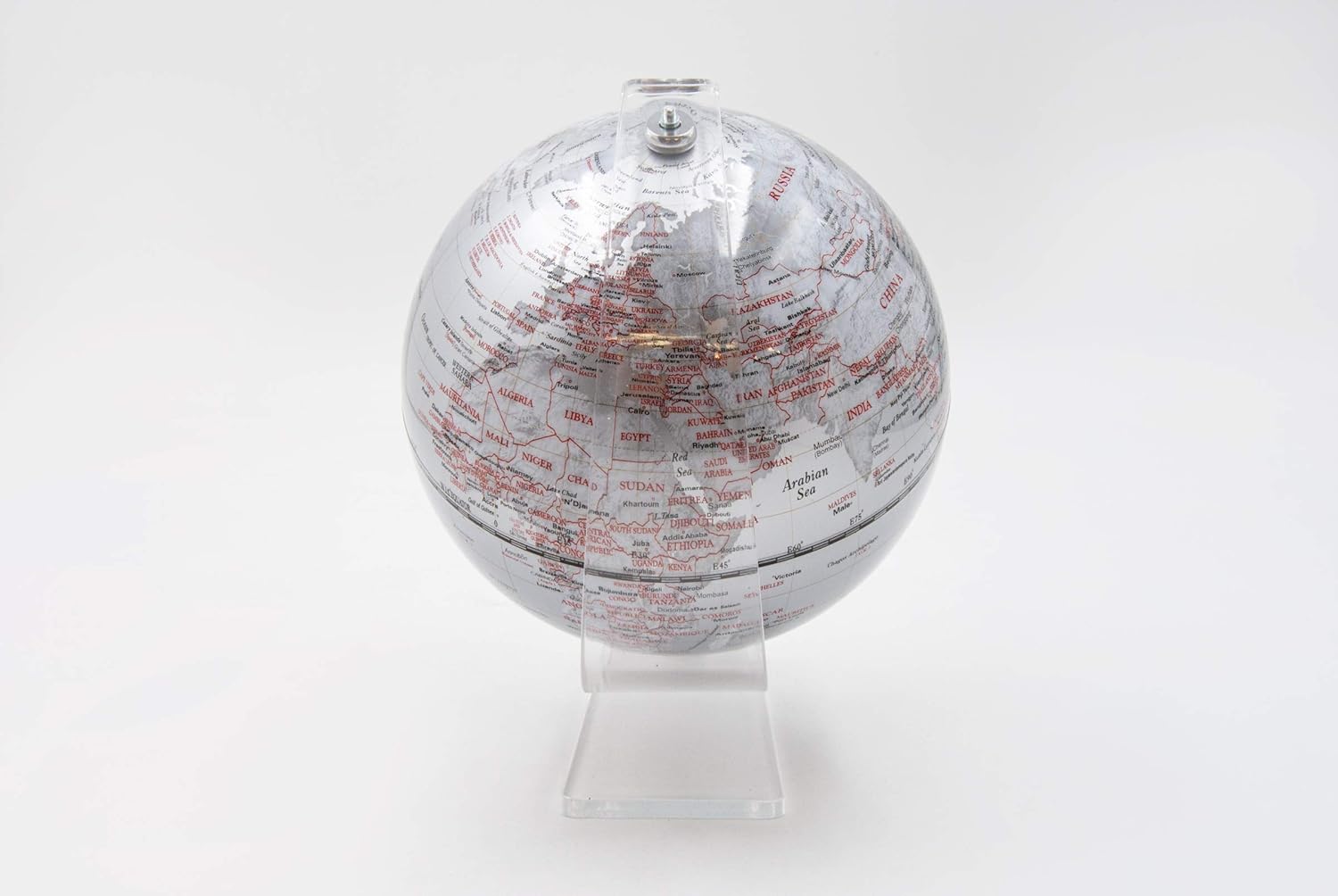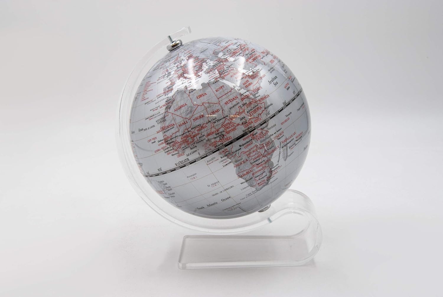Discover an elegant miniature world globe with a clear plexiglass base, perfect for decorating your desk or as a unique gift. Measuring 13 cm in diameter, this detailed and easily readable map lets you explore the world on a miniature scale, with vibrant, clear colors. The globe's silver finish adds a touch of modernity and sophistication, while the plexiglass base ensures stability and a minimalist design. Ideal for those who love modern design and geography. A functional and decorative accessory, perfect for offices, studies, or as a decorative accessory.